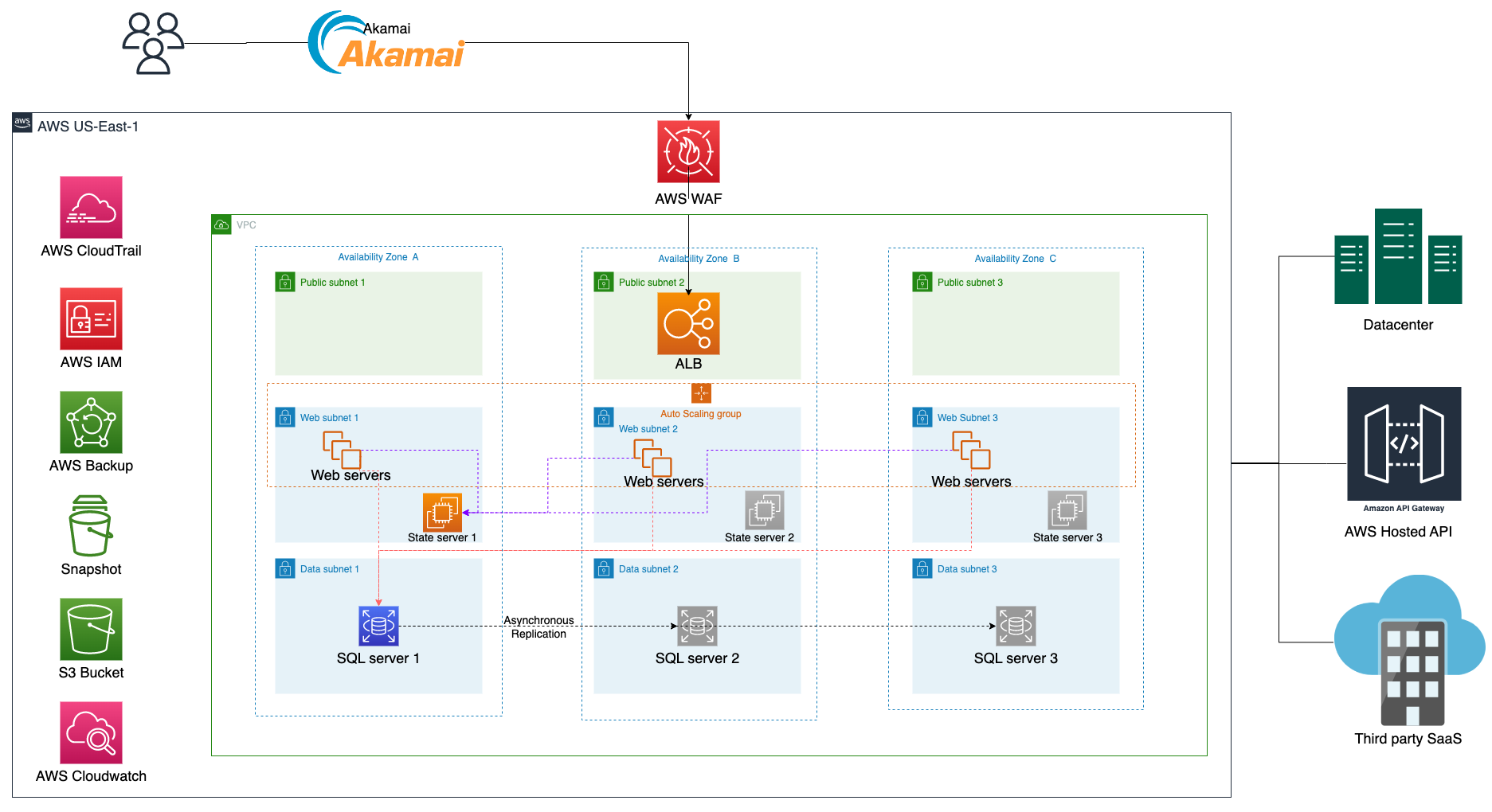 - AWS web application firewall (WAF) to be used to filter source specific traffic from the internet to Akamai, Akamai to filter the traffic to the AWS Application Load Balancer (ALB), AWS ALB to distribute traffic between servers