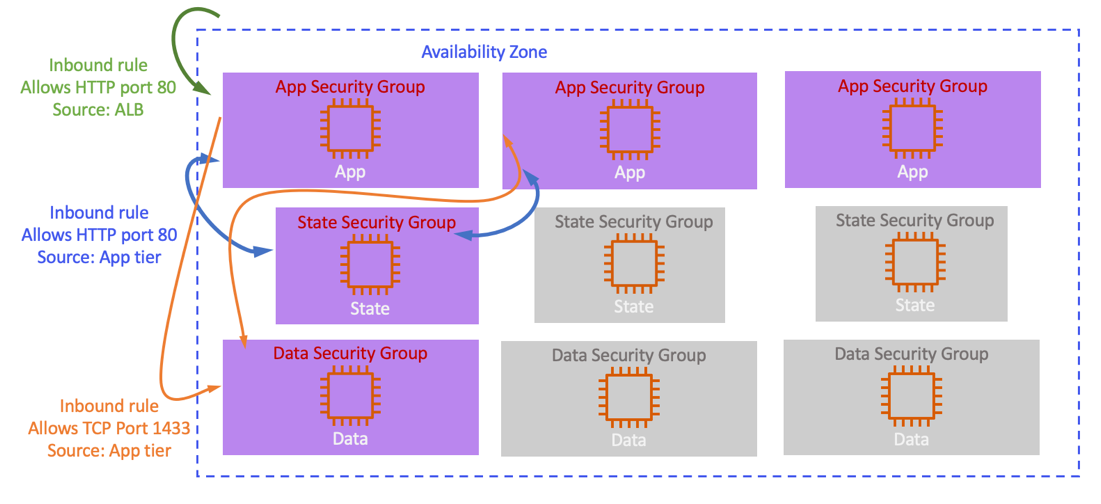 - Security Group Chaining for establishing communication between Application Servers, State Servers and Database servers