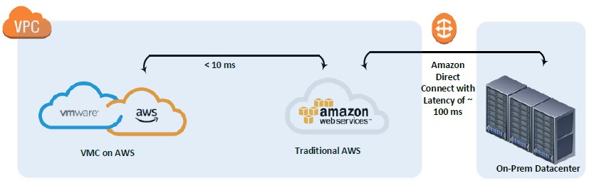VMC On AWS can be chosen to be on the same availability zone as your Native AWS zone and that can drastically reduce the Turn around time on the networking using the AWS networking backbone , compared to the on-prem WAN connection with higher latency.